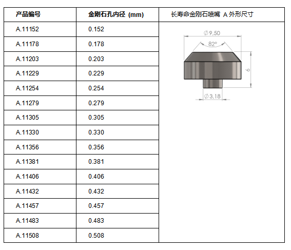 长寿命金刚石喷嘴 A数据表